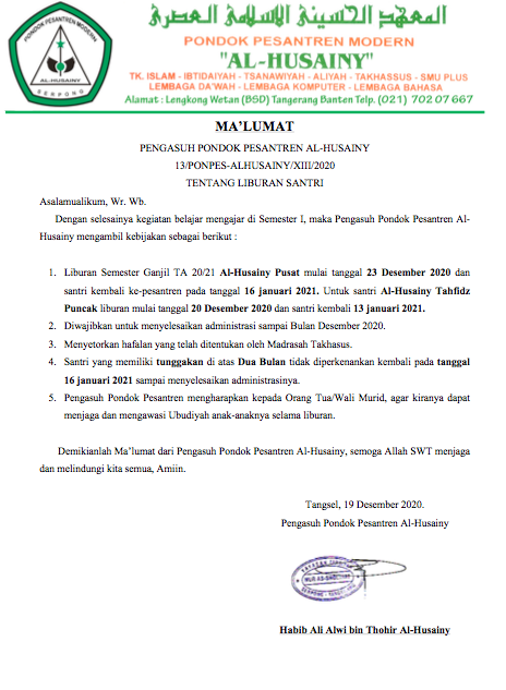 Ma’lumat Liburan Santri Semester Ganjil TA 20/21 Tidak Ada Komentar pada Ma’lumat Liburan Santri Semester Ganjil TA 20/21Dipublikasi di Uncategorized Oleh adminDipublikasi pada Desember 21, 2020 Akses PDF ma’lumat pada Link di bawah ini Ma’lumat Liburan